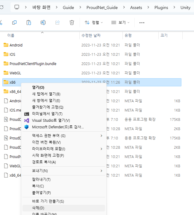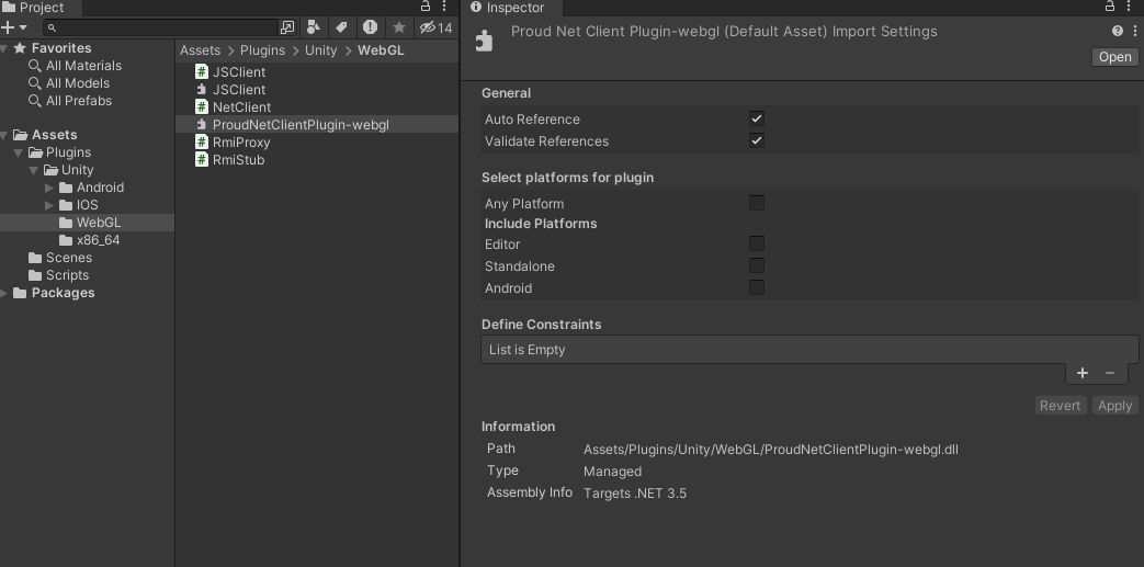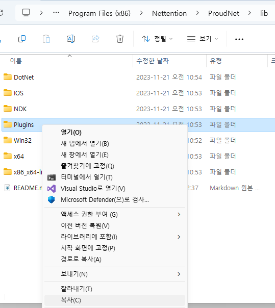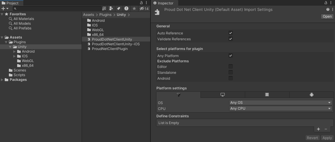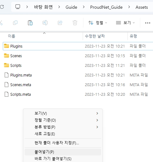 將複製的檔案貼到要使用 ProudNet 的 Unity 專案的 Plugins 資料夾中。