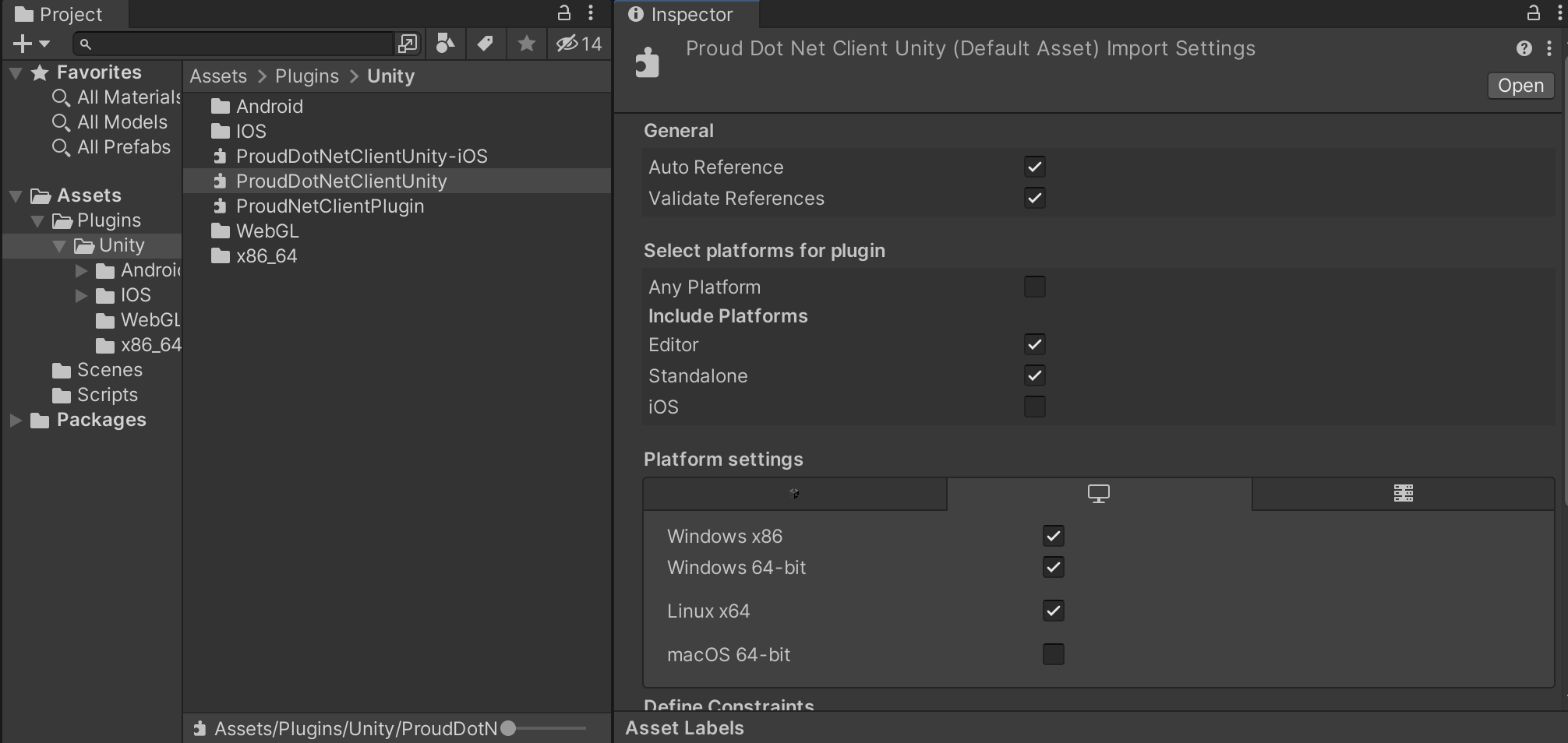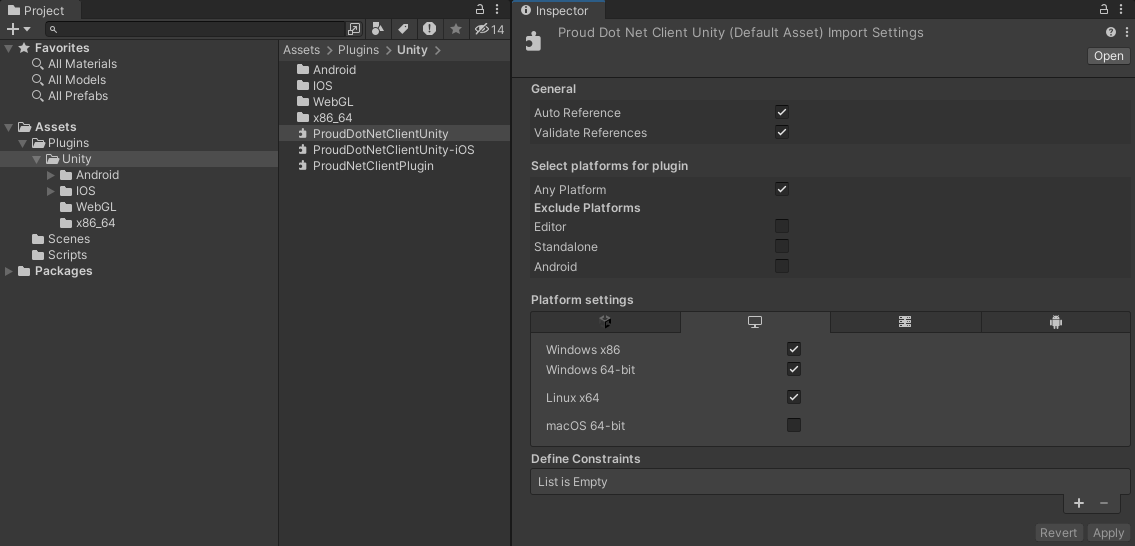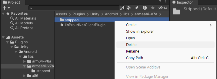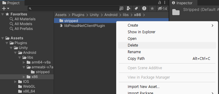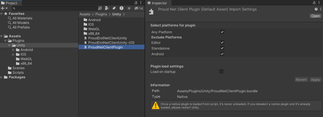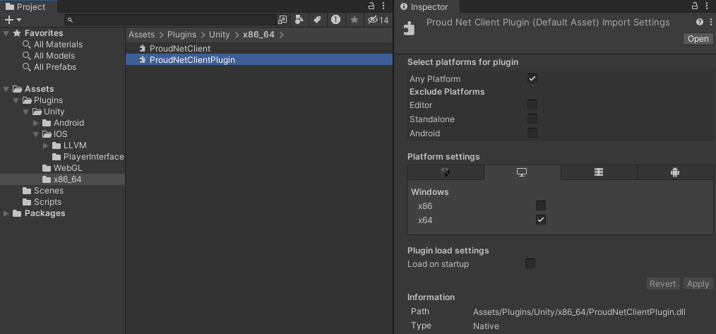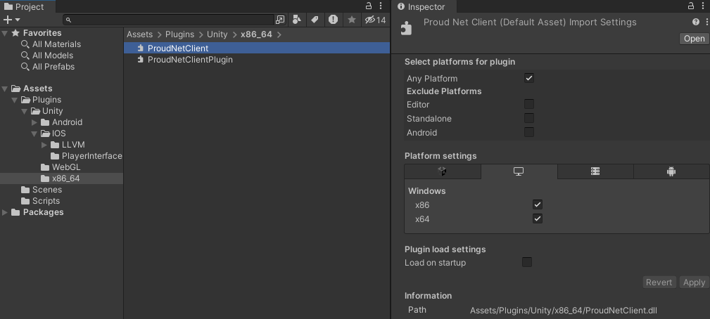 如果將ProudNet安裝路徑中的<mark style="color:orange;">lib/Plugins</mark>資料夾和檔案放入Unity專案路徑中的<mark style="color:orange;">Assets/Plugins</mark>中，則ProudNet程式庫將包含在專案中。