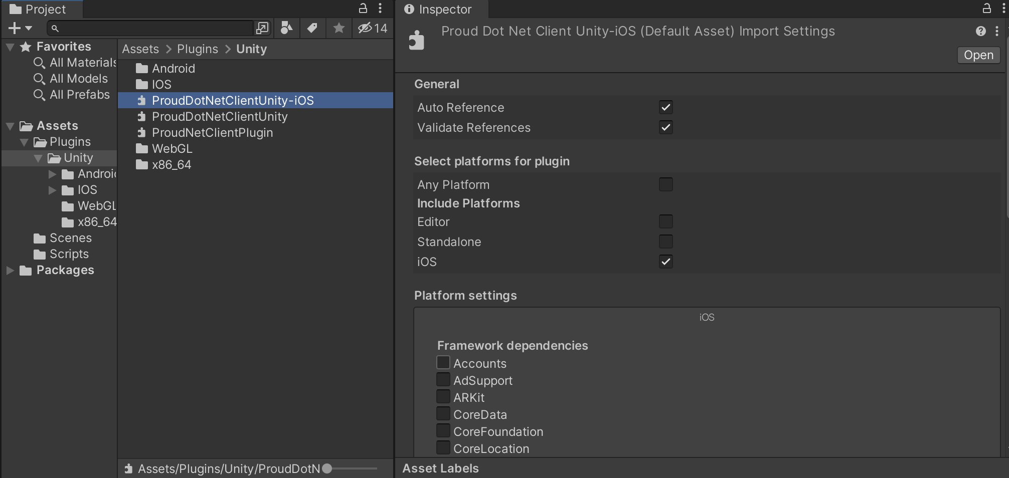 <figure><img src="https://content.gitbook.com/content/hhO5qj4oN2uLfVC5EG5W/blobs/BOJ8e6A3iCwjcpKIssSc/plug_ios.png" alt=""><figcaption><p>Mac - ProudDotNetClientUnity-IOS</p></figcaption></figure>