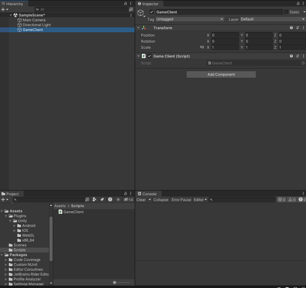 <figure><img src="https://content.gitbook.com/content/hhO5qj4oN2uLfVC5EG5W/blobs/M3SLOEf7xlZr8qXCOxE8/Unity_setting_7.png" alt=""><figcaption><p>將 GameClient.cs 作為元件加入空遊戲物件的範例</p></figcaption></figure>