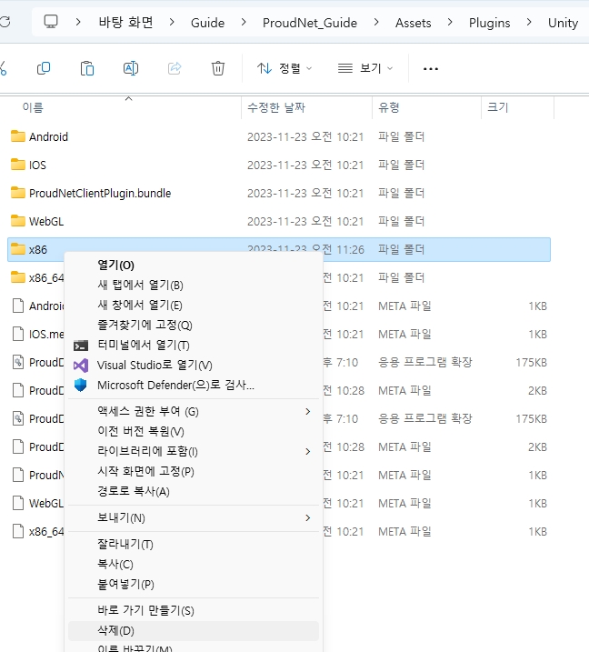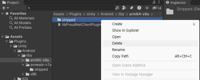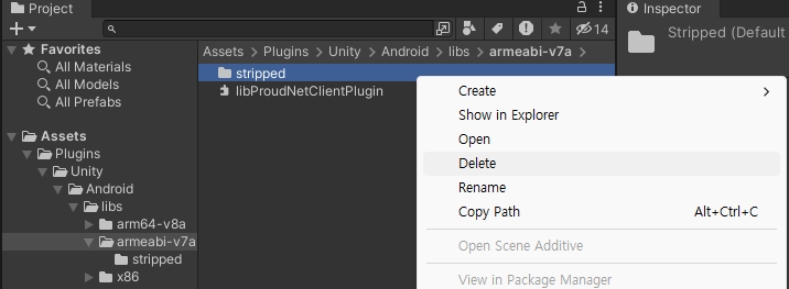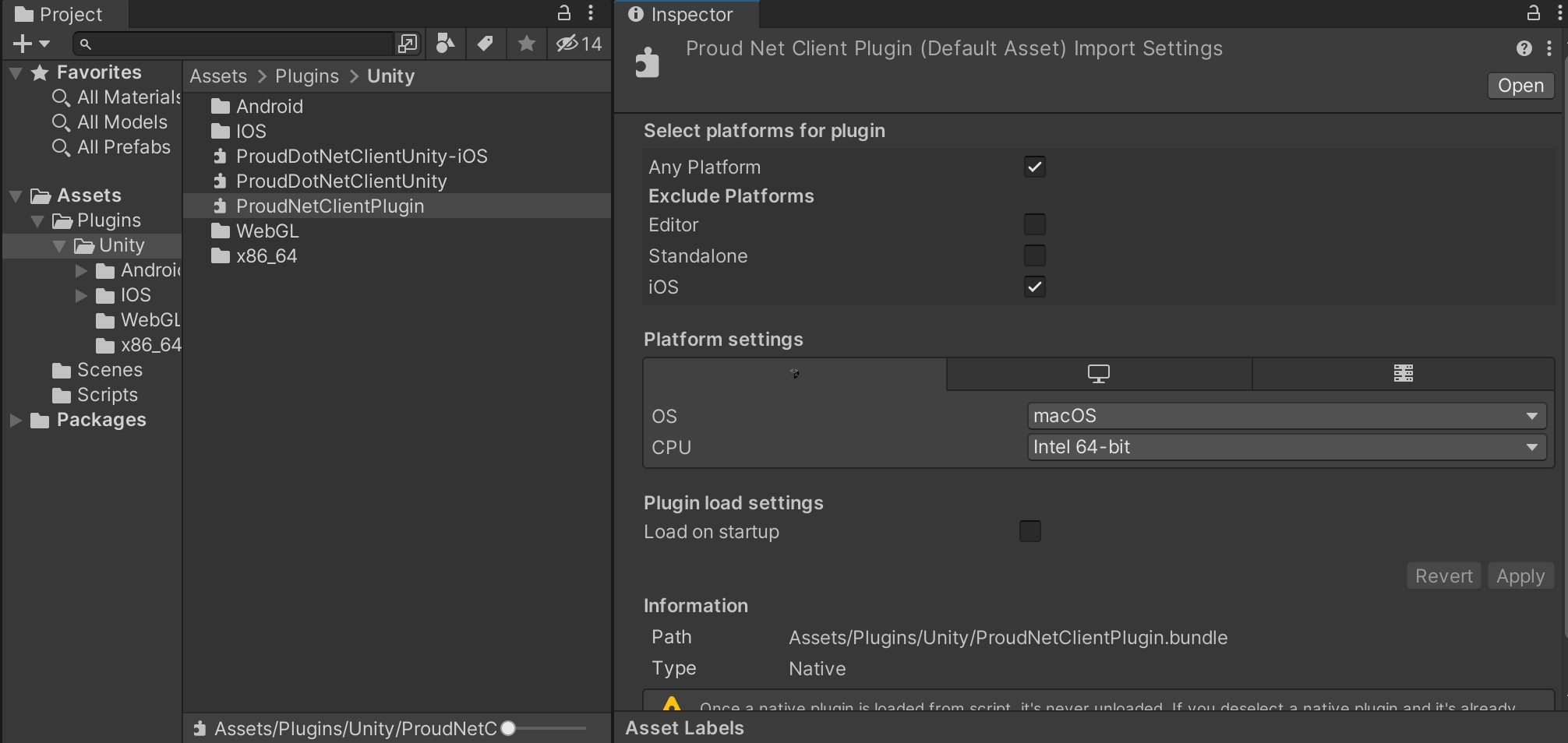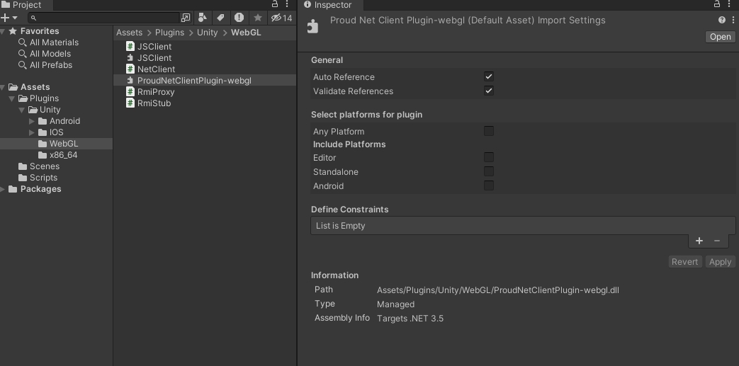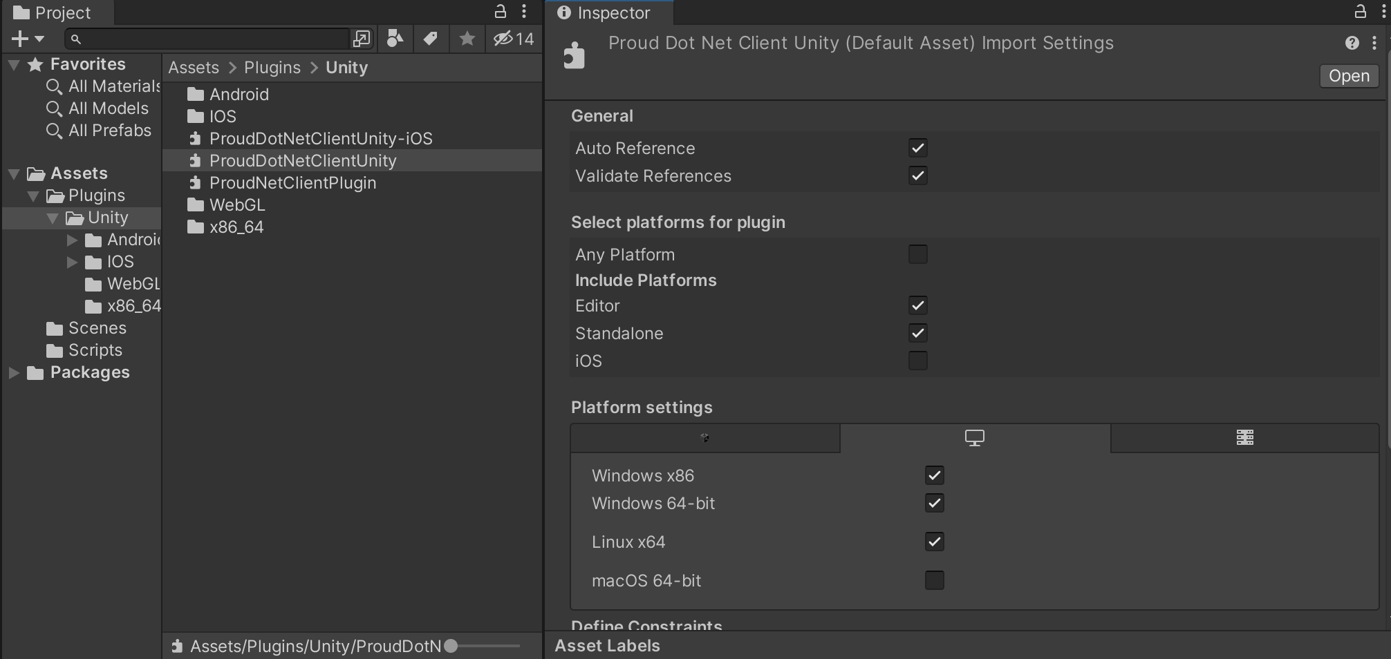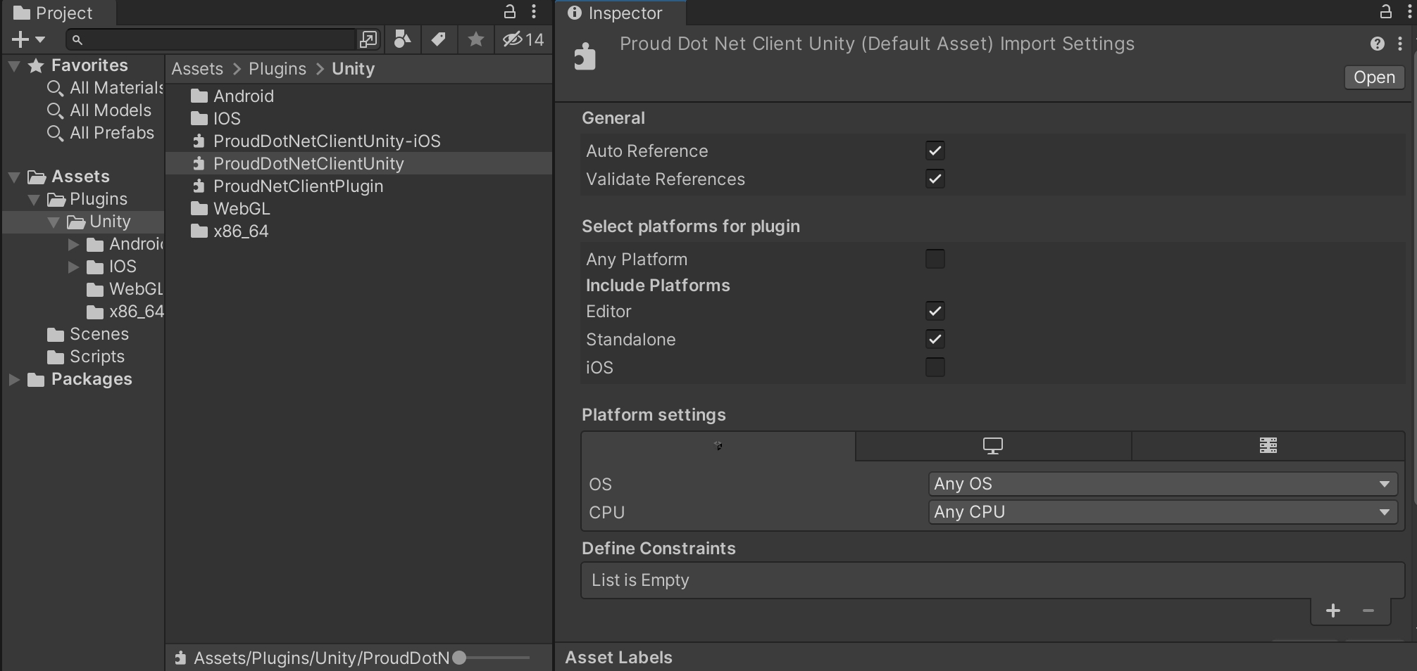 如果將ProudNet安裝路徑中的lib/Plugins資料夾和檔案放入Unity專案路徑中的Assets/Plugins中,則ProudNet程式庫將包含在專案中。