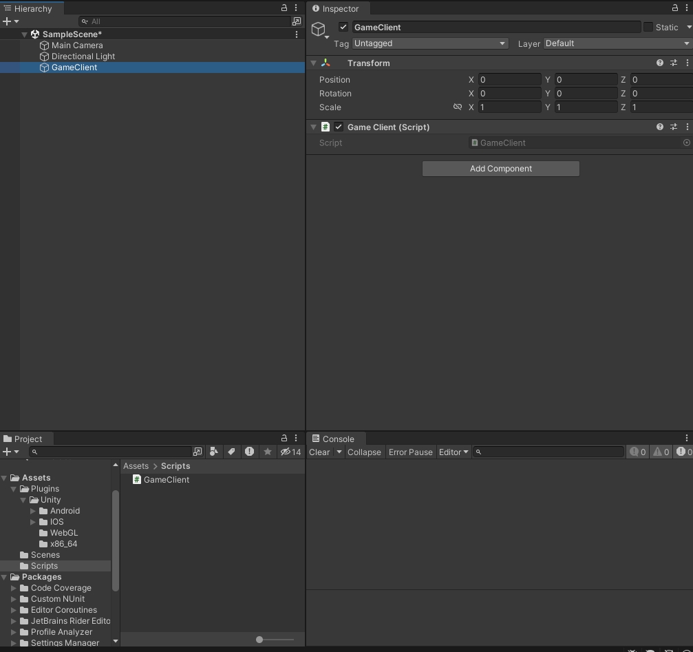 您可以使用以這種方式建立的腳本文件,將其作為組件添加到要用作客戶端的遊戲物件中。
