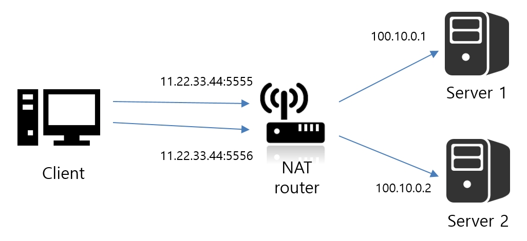 假設Server1和Server2位於路由器後面,請查看下面的圖片。 每個服務器都有一個名爲10010.0.1、10010.0.2的專用地址,路由器爲每個服務器提供11.22.33.44:5555和11.22.33.44:5556的端口轉發。