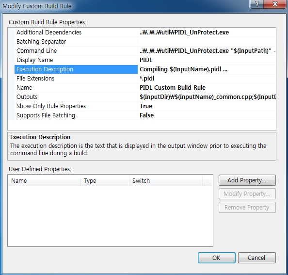 Display Name : 這是將在自訂建置規則中顯示的名稱。 例如) PIDL 規則 File Name : 建立規則檔名。 例如)PIDL_Custom_Build_Rule Directory : 指定規則檔案的儲存位置。 例如) C:\XXX\YYY