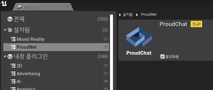 In the Unreal Editor, press <mark style="color:orange;">Edit</mark> -> <mark style="color:orange;">Plugins</mark> to check whether the ProudChat plugin you copied is enabled in the Plugin Browser tab.