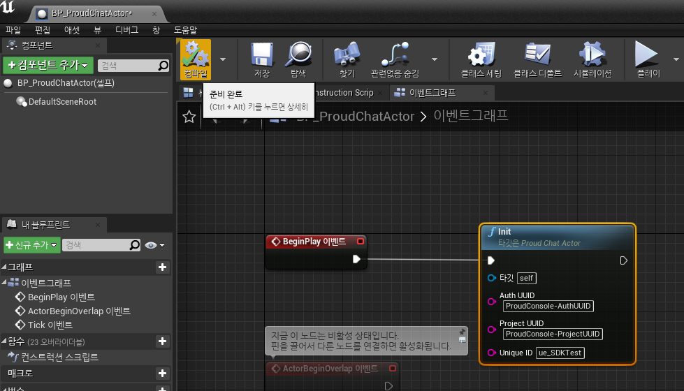 In the Event Graph of the 'Blueprint class' you created, create an <mark style="color:orange;">Init</mark> function for Proud Chat, connect it to the <mark style="color:orange;">BeginPlay</mark> event, and enter the <mark style="color:orange;">Account UUID</mark>, <mark style="color:orange;">Project UUID</mark>, and User <mark style="color:orange;">UniqueID</mark> that you received from the Proud Console.