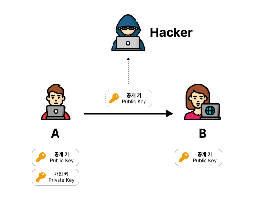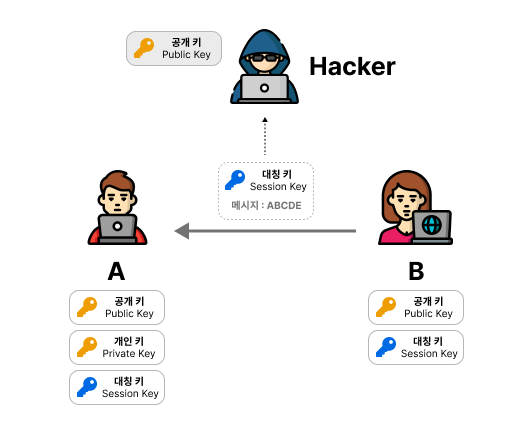 B encrypts the public key received from A with its symmetric key and sends it to A. A decrypts the received symmetric key with its private key and shares the symmetric key created by B. In this process, even if the hacker obtains the public key and the encrypted symmetric key, he or she does not have the private key and cannot know the contents of the symmetric key.