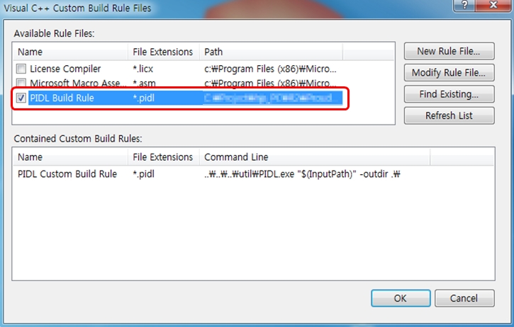 Display Name : the name that will be displayed in Custom Build Rules. ex) PIDL Rule File Name : create a rule filename. ex) PIDL_Custom_Build_Rule Directory : specify the location where the rule file will be saved. ex) C:\XXX\YYY